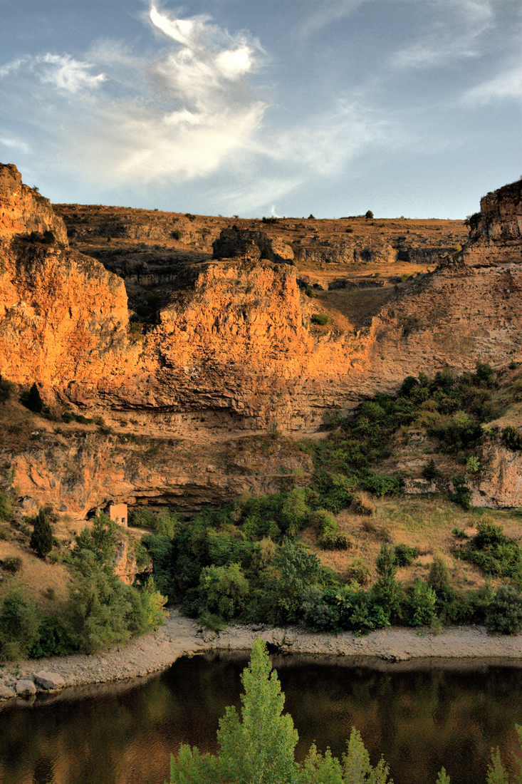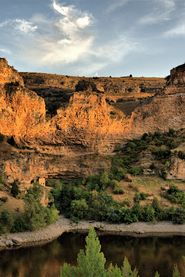 En la fotografía, a la luz del atardecer, podéis ver otro de los rincones interesantes de las Hoces del Duratón, la cueva de Santa Engracia. Los dos cortes que se ven en la parte superior de la pared del cañón son, según los expertos, dos afluentes del río que en tiempos remotos se quedaron suspendidos debido a la erosion de las aguas del Duratón.