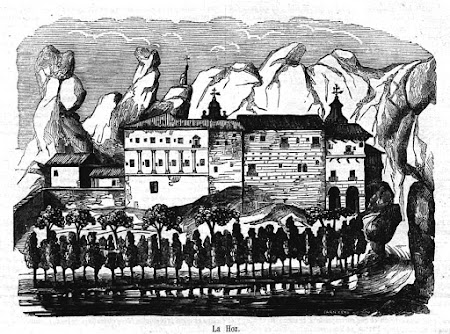 camino con tal fuerza, que causa terror por el estruendo que producen sus aguas al chocar con las breñas y peñascos disformes que á cada paso se desprenden: parece que el diluvio universal estrelló aquí toda su fuerza, desentrañando la tierra, por ser la profundidad que se descubre en el espacio de cuatro leguas continuas, de casi cien varas; cuya altura forma unas murallas que defienden al citado santuario. No se sabe el año de su fundación: tiénese por muy cierto haberse fundado primero en este sitio y lugar de Nuestra Señora de los Ángeles una casa y monasterio de Monges, donde siempre resplandeció la disciplina regular; los cuales poseyeron la dicha casa por mucho tiempo hasta la general invasión de España. Entonces los monges la desampararon, y los moros la destruyeron y robaron; así estuvo la dicha casa sin haber quien la habitase y morase mas de cuatrocientos años; la hermita quedó sola, y los señores Hoces procuraron consevar la iglesia, que fué siempre sepultura y entierro perpetuo de ellos, como la patentizan los sepulcros de piedra que se hallan dentro de la misma iglesia. Llamóse aquel antiguo monasterio S. Pantaleon de la Hoz.